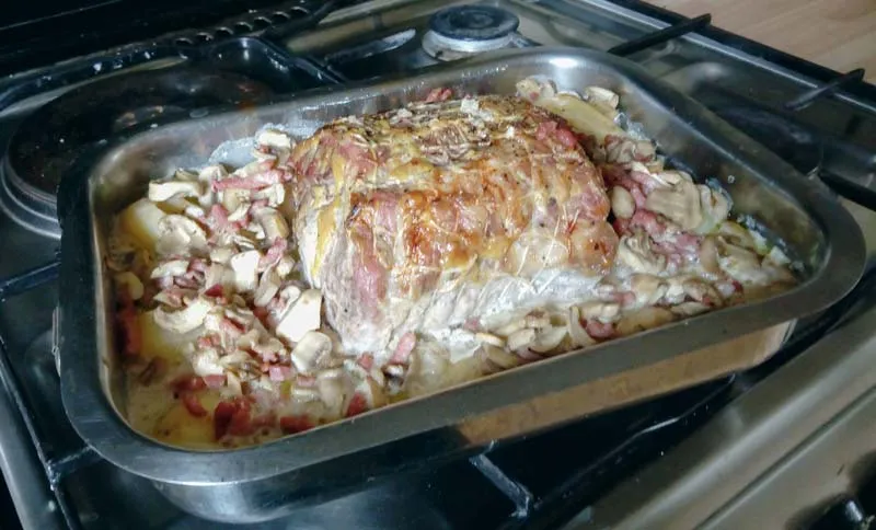 - Au moment de retourner le rôti, placer les champignons et les lardons autour du rôti et terminer la cuisson (20 mn environ).