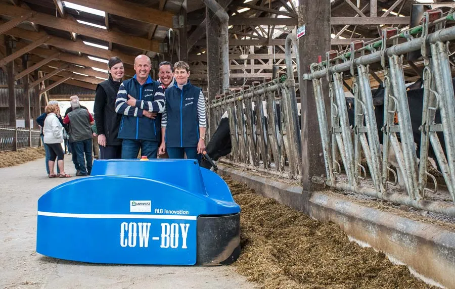 « L’automate trayait bien et nous a rapidement libérés du temps. Mais à l’auge, les vaches ne consommaient pas correctement », raconte le couple. « Pour les stimuler, nous venions cinq fois par jour repousser la ration au rabot manuel le long des 100 m de table d’alimentation. Une corvée physique… » Il y avait bien la possibilité d’une lame poussée par un quad ou un tracteur. « Mais il fallait toujours un chauffeur. L’astreinte d’être présent régulièrement aurait été là. » La solution est encore venue de la technologie. « Au Space dernier, j’avais repéré un prototype de robot repousse-fourrage », raconte Patrice Toquet.