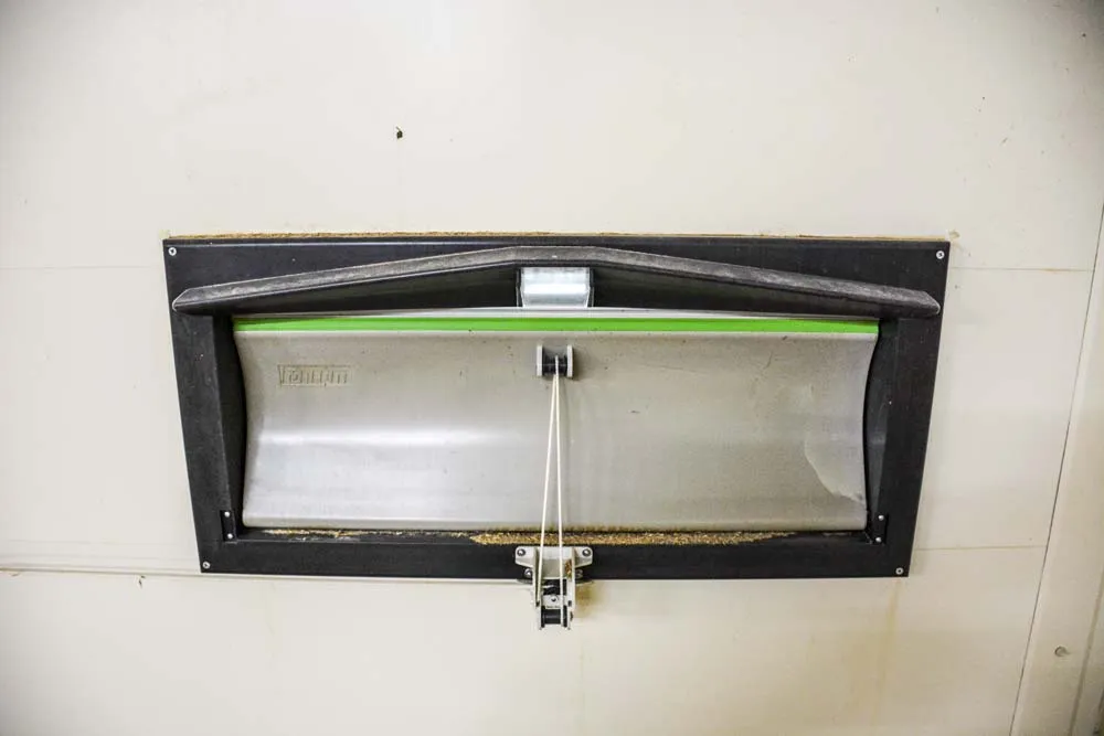 La trappe d’entrée d’air joue un rôle important pour assurer une bonne ventilation dans le poulailler. Fancom mise sur une trappe avec une forme spécifique et fait le choix de toutes les ouvrir pour assurer une veine d’air régulière sur la longueur du bâtiment.