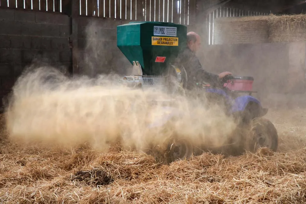 L’hiver dernier, ils ont apporté de la dolomie une fois par jour avec la pailleuse en mélange avec la paille, ce qui a permis une maîtrise de la température de la litière et ainsi le curage a pu être réalisé au minimum toutes les 8 semaines. Pour l’hiver prochain, l’objectif est de pailler le matin et de déposer le sable dolomitique le soir à l’aide d’une saleuse Delimbe installée sur un quad. Pour aboutir à cette organisation, les éleveurs ont cherché l’outil le plus adapté pour étaler le sable, mais pas seulement, la dolomie, aussi, a évolué : il est possible désormais d’avoir un sable dolomitique passé au four (asséché) appelé Irilit se répartissant parfaitement bien sur l’aire paillée.
