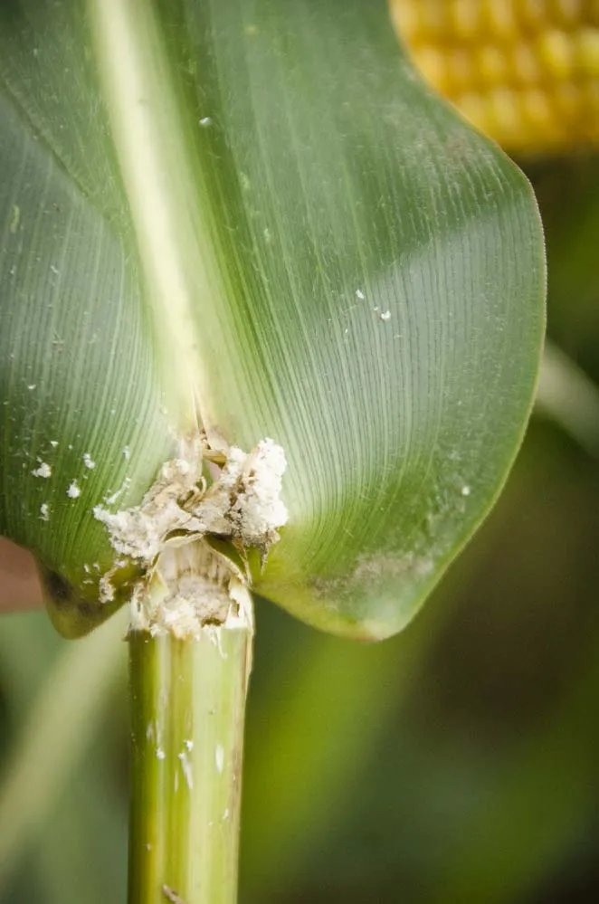 En production de maïs grain, l’impact sur la production peut être à la fois quantitatif et qualitatif. En creusant des galeries dans les tiges, les larves de pyrales entraînent la casse des tiges et la verse, avec parfois des épis tombés au sol, causant des pertes directes. En cas d’attaque de forte intensité, une baisse du poids des grains peut aussi être observée. L’autre aspect est la dégradation de la qualité sanitaire des grains. Les galeries provoquées par les larves constituent des portes d’entrées pour des champignons fusarium, augmentant ainsi le risque de développement de mycotoxines.