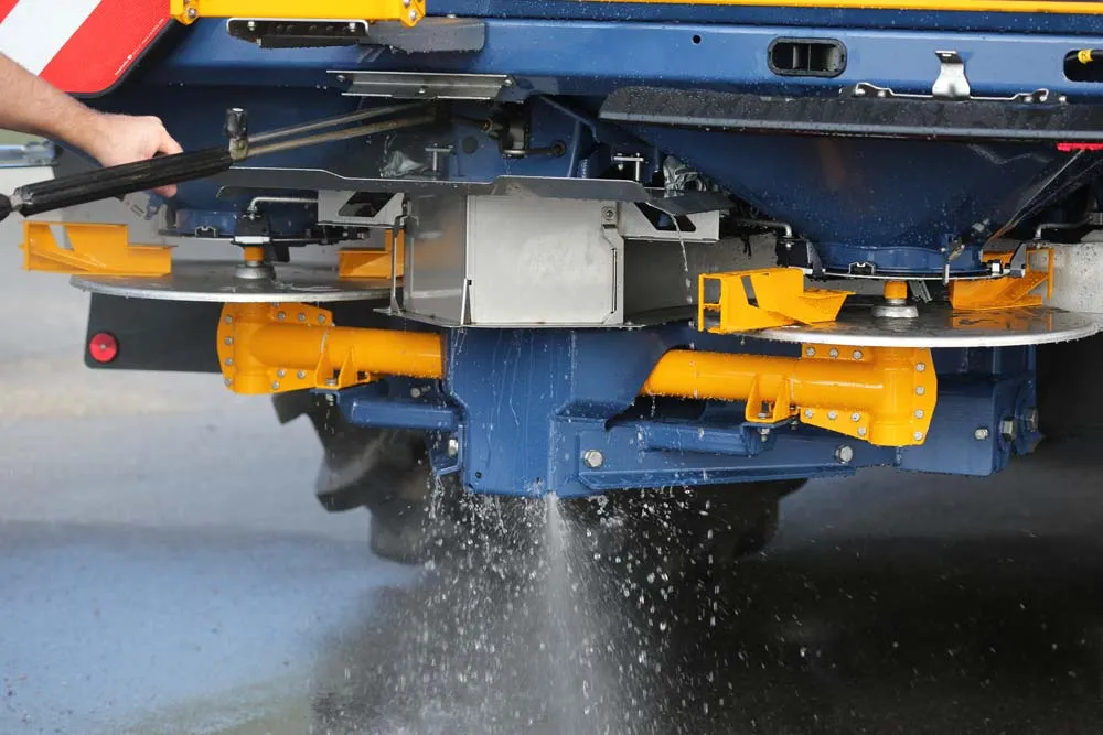 Le nettoyage efficace et facile de l’épandeur d’engrais est une demande prioritaire des agriculteurs. Les nouveaux déflecteurs intégrés dans le châssis répondent à cette exigence et offrent un accès facile. Les déflecteurs guident l’eau vers les endroits les plus cachés du châssis. De plus, les carters de protection (norme EN14017/A1) de disques se déplient, les garde-boue et les panneaux réflecteurs s’escamotent pour un accès facile et un nettoyage complet. Ces nouvelles fonctionnalités facilitent considérablement le nettoyage.