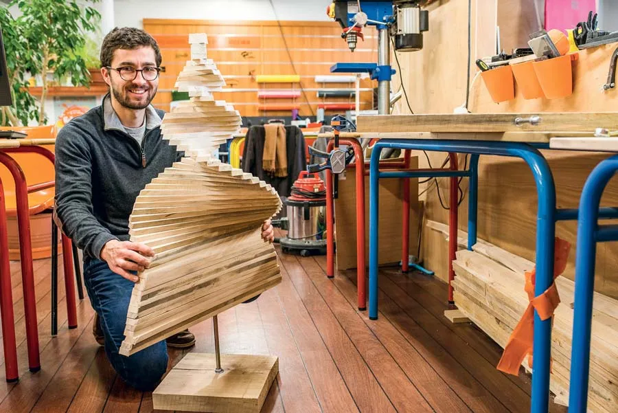 Cet esprit vif et créatif associé à ces mains calleuses et expertes de travailleur sont le fruit d’un parcours marqué par la passion et l’abnégation (voir encadré). Un an après être sorti de l’école, à 23 ans, après une courte expérience en architecture d’intérieur, le Costarmoricain s’est jeté à l’eau en découpant et assemblant ses premières productions. « Sans ressource pour démarrer, je me suis rapproché de Saint-Brieuc Factory, le FabLab installé au port du Légué. »