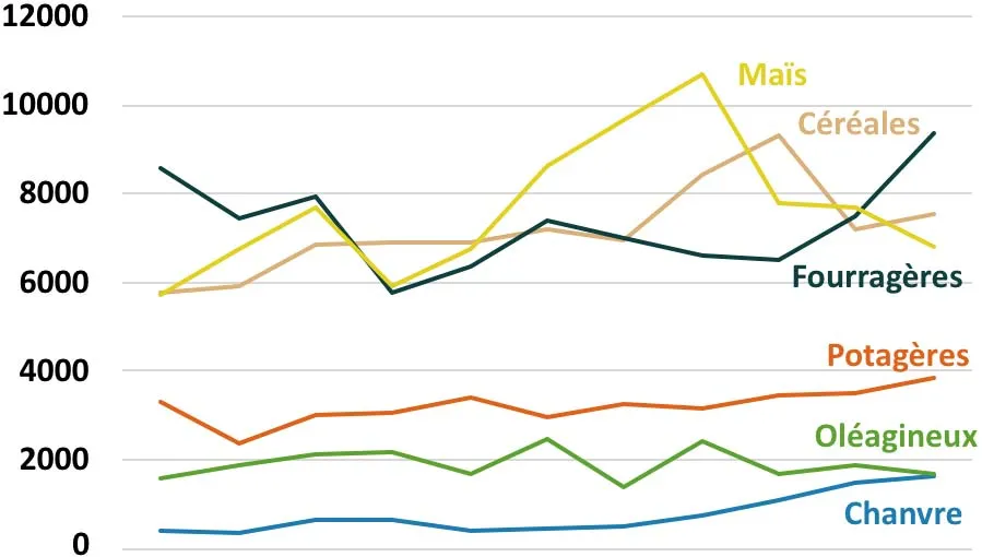 | Lin et chanvre | 2213 ha | 10% | +19% |