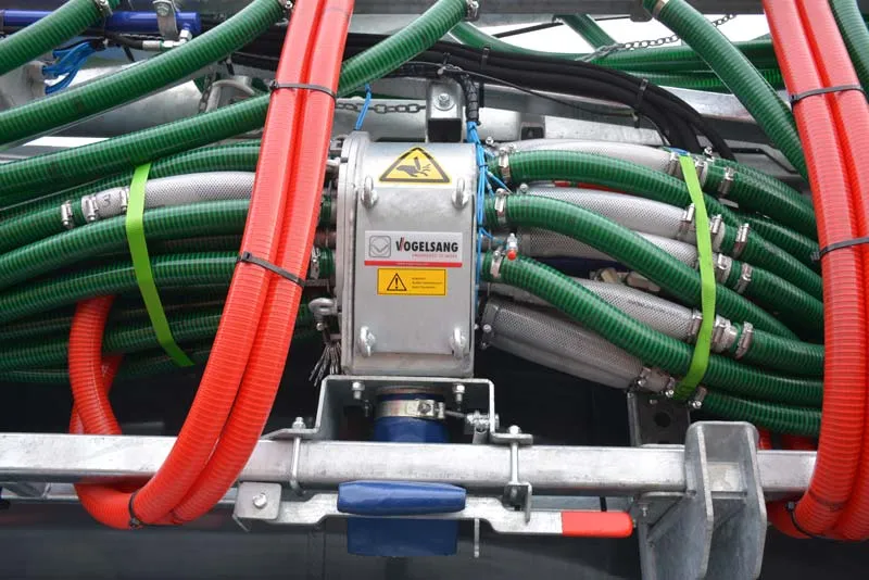 « Nous voulions une rampe à pendillards qu’il n’était pas possible d’installer sur l’ancienne tonne. Nos adhérents sont majoritairement éleveurs laitiers. Il faut de la pression et un broyeur intégré à la la tonne pour épandre du lisier de bovins avec une rampe de 24 mètres de largeur qui correspond à celle des pulvérisateurs », explique Cédric Levèque, salarié responsable du parc matériel. La rampe est équipée de l’option coupure de tronçons (15, 18 et 21 mètres) et de la coupure sur les tuyaux de descente positionnés juste derrière les roues. La tonne peut également être équipée d’une rampe d’enfouisseurs de 6 mètres de longueur.