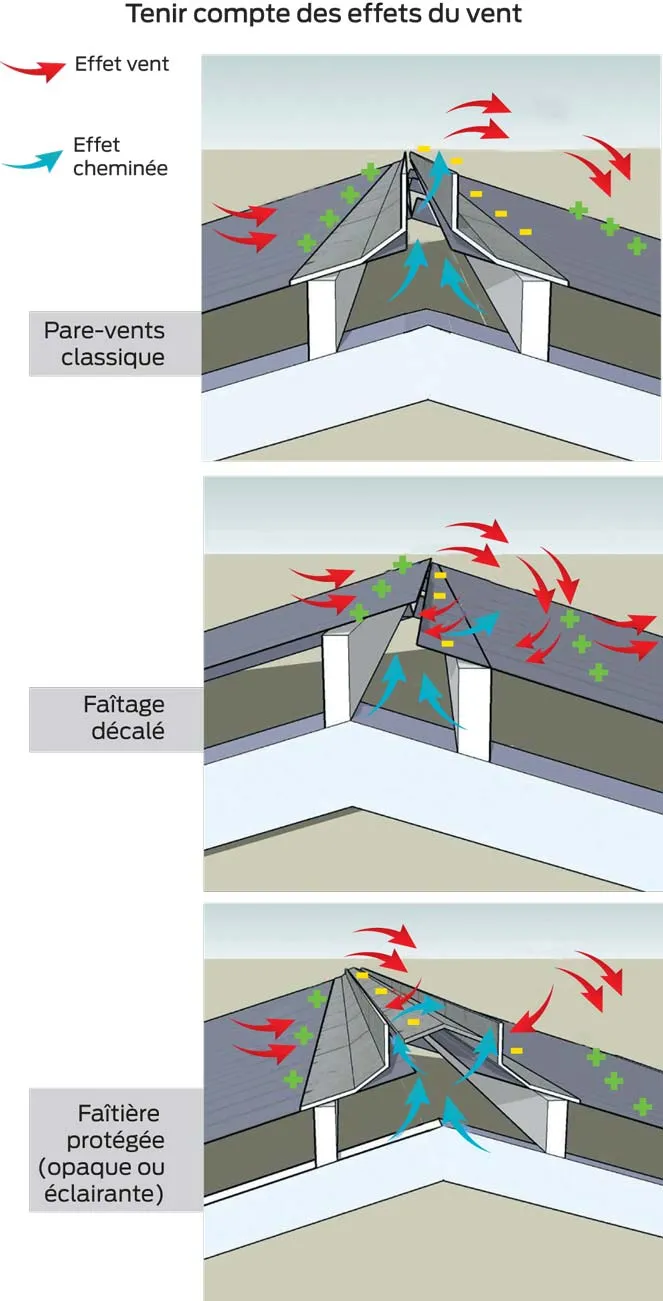 La faîtière décalée est une solution économique, avec deux pentes de toitures qui ne se rejoignent pas au sommet, laissant idéalement une ouverture de 25 cm. L’ouverture à l’est est recommandée pour limiter le risque d’entrée de pluie. Avec un dôme éclairant aussi, il faut s’assurer que l’air est bien évacué au faîtage. L’installation de pare-vent au-dessus permet un effet cheminée. La toiture « écaille », avec un jour entre deux rangées de plaques ondulées, est moins courante sur les bâtiments neufs. « Mieux vaut prévoir de vraies entrées d’air relais. »