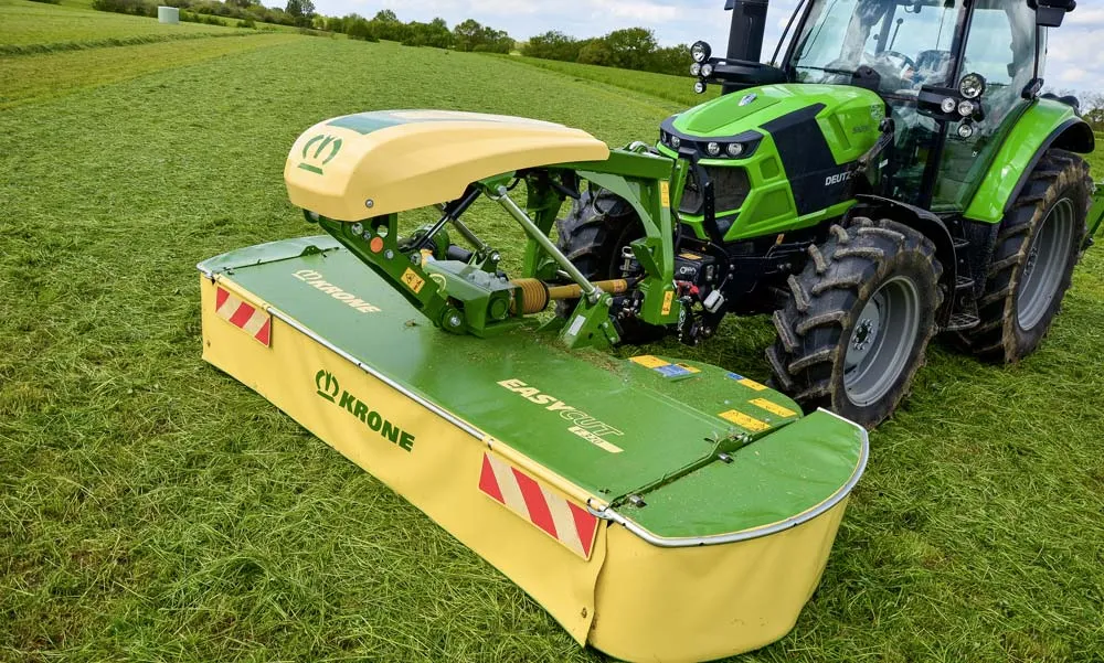 Krone continue de développer sa gamme en présentant la nouvelle faucheuse frontale tirée Easy Cut F320 Glide. Cette faucheuse de nouvelle génération reprend les techniques éprouvées des autres modèles de la gamme au niveau du lamier. Elle y intègre donc la sécurité SafeCut, le lamier caissoné soudé étanche sans entretien, le verrouillage rapide des couteaux. La nouveauté réside dans son mode d’attelage et de suspension. « Le sur-châssis permet une traction du lamier et donc un suivi de sol optimal avec notamment la possibilité de s’effacer vers l’arrière et vers le haut en cas d’obstacle. La suspension est assurée hydrauliquement et réglable en continu. Le relevage en fourrière s’opère grâce à un distributeur », expliquent les concepteurs. Pour réduire la largeur de l’andain, cette faucheuse est équipée de deux grands tambours entraînés recentrant le fourrage.