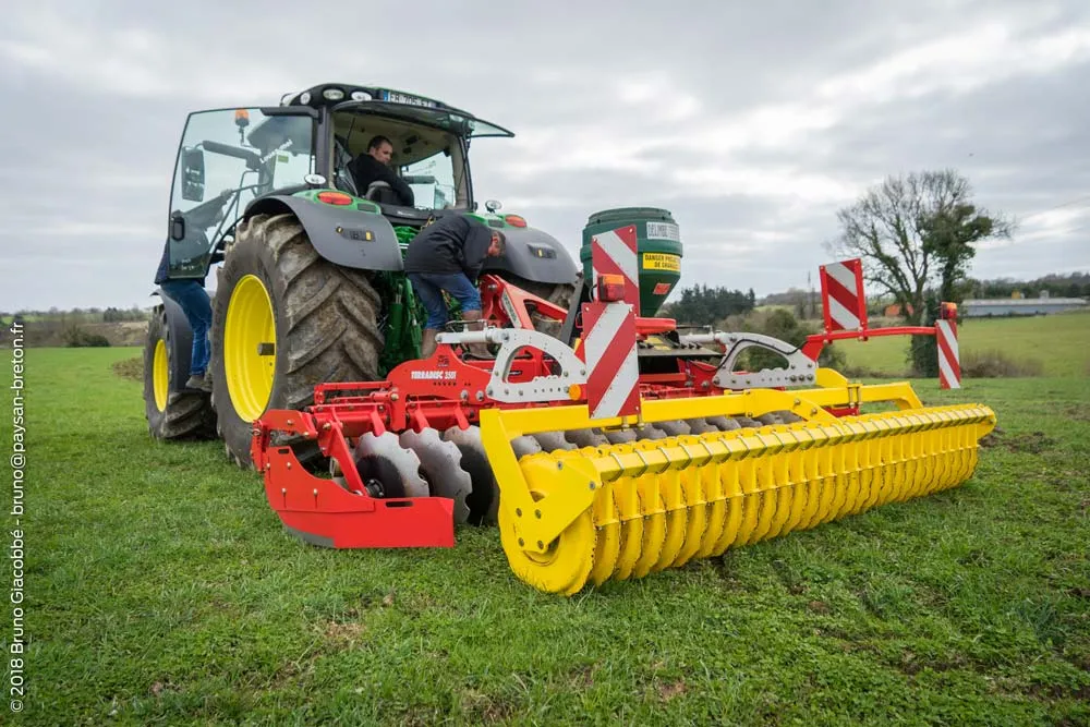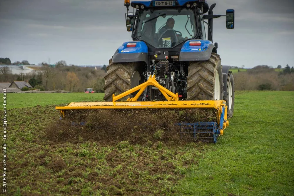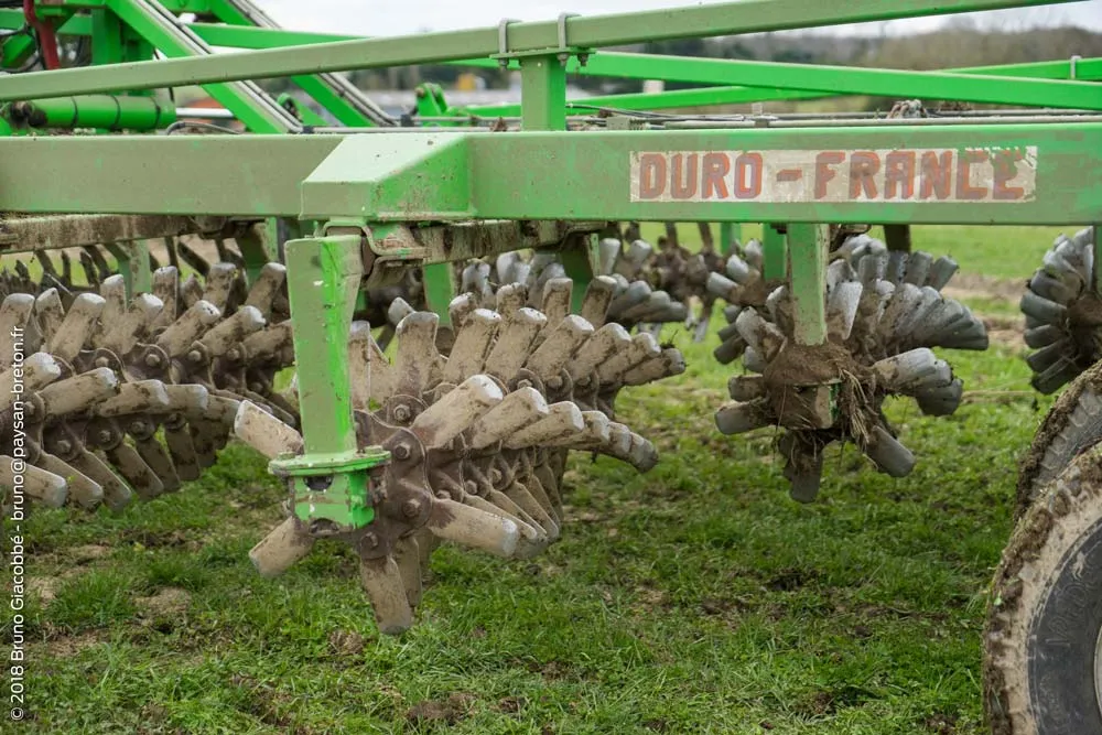 Le Duro Compil, qu’on ne présente plus tant il est polyvalent, est un outil muni de bêches roulantes. Pour la destruction de la prairie ou même d’un couvert, les lames rentrent dans le sol avec un angle et provoquent un effet coup de cuillère. Les végétaux sont ainsi blessés puis intoxiqués par la terre rappuyée par le double rouleau à l’arrière. On peut dénombrer 70 a 80 points d’impact au mètre carré sur le sol. L’outil est roulant