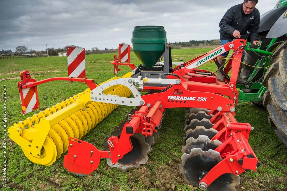 Le constructeur autrichien Pöttinger présentait son TerraDisc 3501, un déchaumeur à disques d’une largeur de travail en 3,50 m. Cet outil à portée fixe possède une première rangée de disques en diamètre 580 mm à roulements sans entretien. Ils fonctionnent 2 par 2 afin d’éviter un effet « pianotage » lors du travail sur un sol rocailleux. Le réglage de la profondeur se fait hydrauliquement. Pour respecter les normes routières en termes de largeur, les extensions de l’outil sont repliables. Pour la démonstration, le déchaumeur était équipé d’un rouleau profilé, mais d’autres types sont disponibles au catalogue du fabricant.
