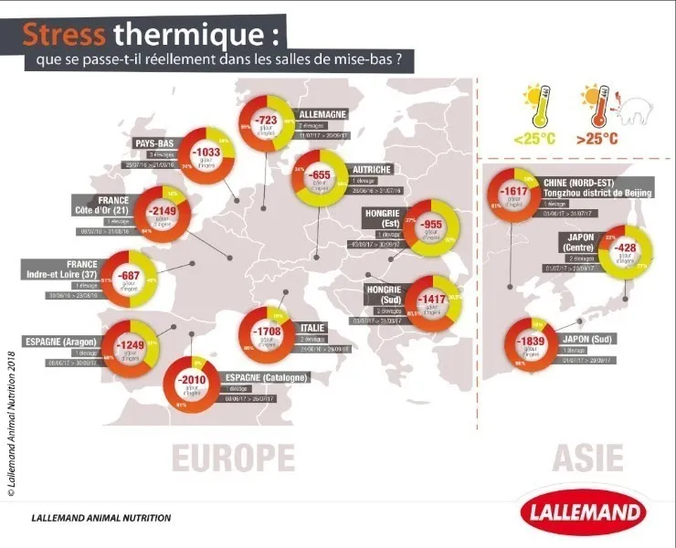 Lallemand Animal Nutrition met à jour la carte du risque de stress thermique pour les truies en Europe et Asie. Les résultats indiquent qu’en été, les truies allaitantes pourraient passer de 23% à 90% de leur temps au-dessus du seuil de stress thermique (25°C), ce qui se traduirait par des baisses d’ingéré allant de 655 g à plus de 2 kg par jour et des risques bien au-delà de la période estivale.