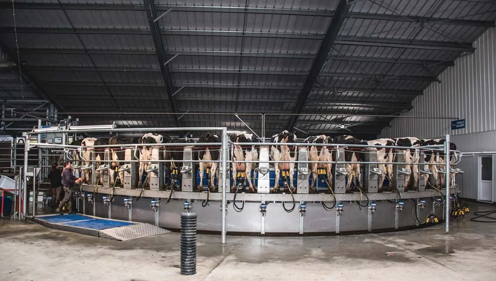 « À deux opérateurs, la cadence dépasse aujourd’hui 250 vaches à l’heure. » Sur une zone équipée d’un plancher mobile, le premier prépare la mamelle, le second pose les gobelets. « C’est le jour et la nuit », reprennent les éleveurs. « Traire est désormais beaucoup plus agréable. L’ambiance est plus calme. C’est moins fatigant. » Même le lavage semble simplifié. « Avec la lance gros débit, on nettoie plus rapidement que dans une installation 2×15 en ligne. » Reste qu’en roto traite extérieure se pose la question de l’hygiène après la dépose du faisceau. Faut-il prendre le risque de s’en passer ? Envisager un 3e opérateur pour prendre en charge cette tâche ? Investir dans un bras d’application de désinfectant ? « La main-d’œuvre est très coûteuse. Mais l’incidence des mammites à staphylocoque à coagulase négative, dont la contamination se fait pendant la traite, augmente actuellement dans les élevages. »