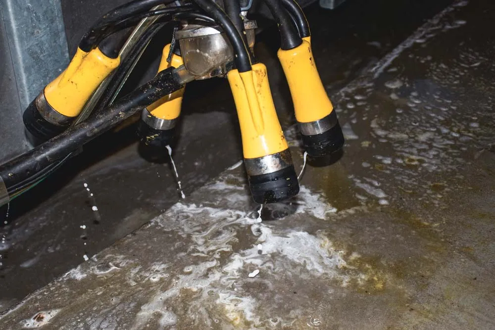 « Quand on passe beaucoup d’animaux, il n’y a pas le choix, il faut sécuriser l’hygiène. Comme dans notre ancienne installation, nous voulions automatiser la désinfection des manchons », explique Ronan Jacq. Les associés ont comparé les devis. L’ensemble des faisceaux trayeurs neufs proposés avec le roto s’élevait à 15 000 €. Un autre modèle du marché avec système de backflush de désinfection, 45 000 €. Enfin, la solution ADF Milking finalement choisie, pour 78 000 €, permettait de gérer à la fois l’hygiène des trayons et des manchons. « Le signal électrique du décrochage automatique enclenche en un instant la pompe du post-trempage. Une spécialité à base d’iode, formulée par le fabricant Hypred dont la viscosité permet la diffusion par les injecteurs du faisceau, imprègne les trayons. Avec l’avantage de maîtriser la consommation de produit : 6,5 ml par jour et par vache », avance François Derot, responsable de la société ADF Milking France qui commercialise cette technologie anglaise.