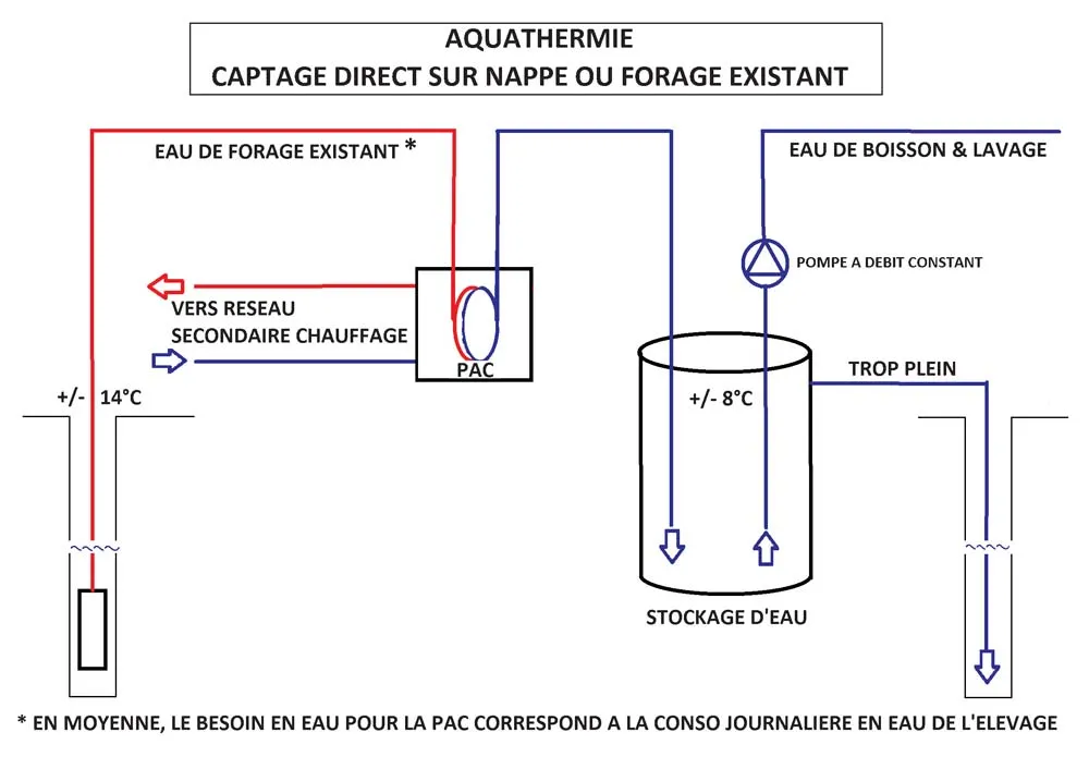 Il y a 4 ans, le Gaec La Cour a fait un pari sur l’avenir, pour le choix de son système de chauffage, en équipant 2 poulaillers neufs de 2 000 m2 chacun d’un plancher chauffant, le tout relié à 4 pompes à chaleur fonctionnant grâce à l’aquathermie. « Il ne faut pas confondre l’aquathermie à la géothermie. Pour chauffer les 4 000 m2 de poulaillers en géothermie, il nous faudrait forer 25 trous de 100 m de profondeur chacun. En aquathermie, 2 forages de 80 m chacun suffisent pour le chauffage et pour alimenter l’élevage en eau de boisson », fait observer Éric Rochefort, le chauffagiste qui s’est chargé de l’installation.
