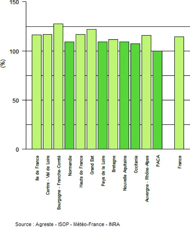 Du 20 mars au 20 avril, la pousse d’herbe des prairies permanentes a été plus importante que celle de la période de référence (+14%). Elle est excédentaire dans la plupart des régions fourragères, atteignant 120 % ou plus de la production de référence dans un tiers d’entre elles. En Bourgogne – Franche-Comté et dans le Grand Est, la pousse d’herbe a été particulièrement importante par rapport à la normale, avec respectivement des écarts de +28% et +22%.