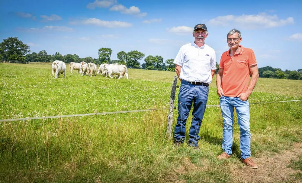Les Charolaises conviennent bien à l’exploitation de Loïc et Nelly Arribard qui compte une dizaine d’hectares non cultivables. Un des deux lots passe derrière les laitières au pâturage.