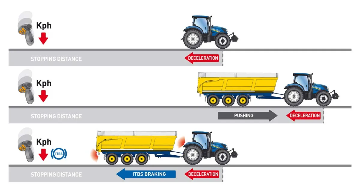 Le système intelligent de freinage de remorque détecte la réduction de la vitesse du tracteur et calcule la force de décélération à l’aide d’un capteur de couple intégré à la transmission. Une valve de freinage à commande électronique enclenche alors automatiquement les freins de la remorque pour réduire la vitesse de la remorque au même rythme que le tracteur. Ce freinage automatisé évite que le tracteur ne soit poussé par la remorque, ce qui améliore fortement sa stabilité et évite le risque de mise en portefeuille. Aucune modification de l’équipement remorqué n’est nécessaire.