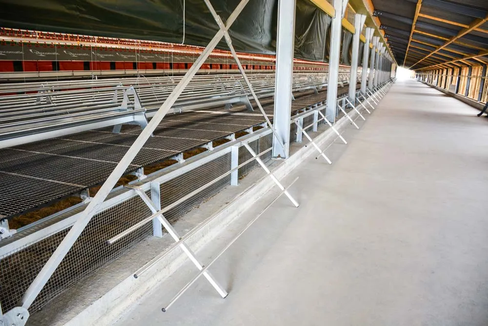 « La particularité de ce poulailler est d’avoir un mur ventilé dans le milieu de la fosse sous les caillebotis », indique Bertrand Bouder, commercial chez Le Couillard. Ce mur vient remplacer les pieds qui sont installés pour soutenir les caillebotis. « L’objectif est de gagner du temps et de faciliter le montage et démontage des caillebotis lors des vides sanitaires. C’est confortable de ne pas avoir à enlever les pieds des caillebotis dans les fientes à la fin du lot. Le surcoût est de l’ordre de 15 000 € mais le gain de temps va permettre de l’amortir rapidement. » Les caillebotis sont de couleur noire, cela permet d’assombrir le bâtiment pour que les poules restent calmes. L’éleveuse anticipe la possibilité d’interdiction de l’épointage dans les années qui viennent.