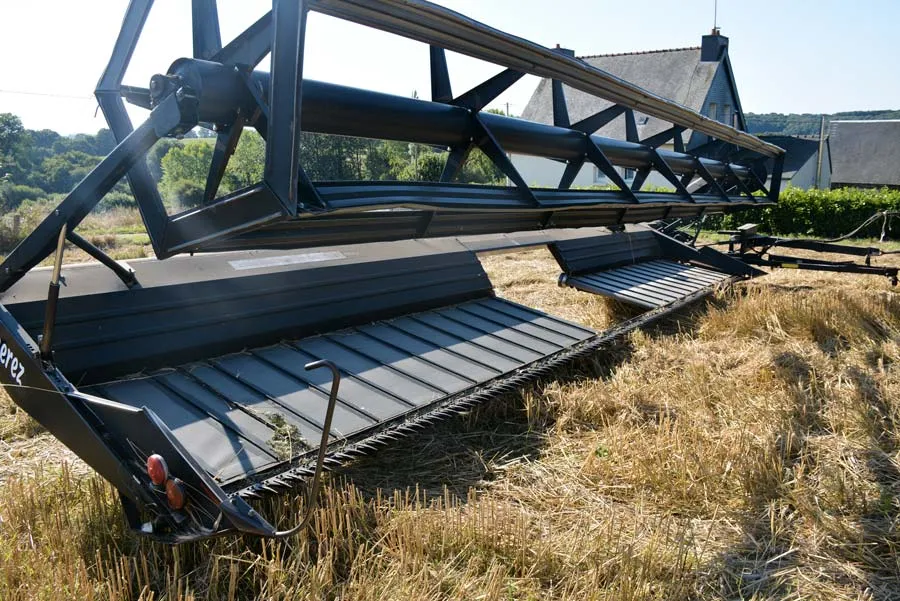« Les machines sont arrivées sur la ferme le 10 juillet, cet été, en provenance du Canada. Le 12 juillet, j’ai réalisé un essai en fauchant du triticale. Quatre jours plus tard, la moissonneuse était dans le champ. Autrement, j’aurais probablement moissonné vers le 10 août ». La faucheuse de 9 mètres de largeur andaine de manière à orienter les épis sur le haut de l’andain. La moissonneuse est équipée du bec pick-up à courroie à son arrivée à la ferme et récolte ensuite les grains.
