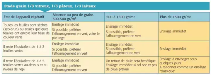 Dans tous les cas, la décision doit être prise en fonction du grain (nombre de grains par m² et stade de maturité) pondéré par l’état de l’appareil végétatif. Si la part des surfaces de maïs stressées est significative sur l’exploitation : plutôt que de trouver un mauvais compromis pour la date de récolte, il peut être judicieux d’envisager 2 chantiers d’ensilage. En récoltant d’abord les parcelles, ou les parties de parcelles, les plus avancées.