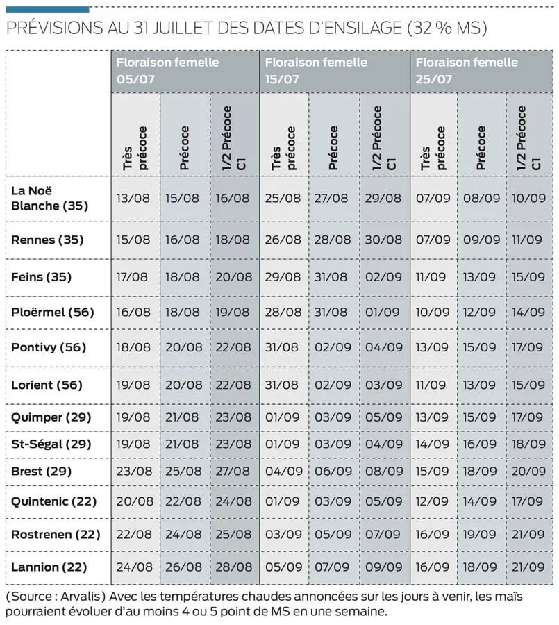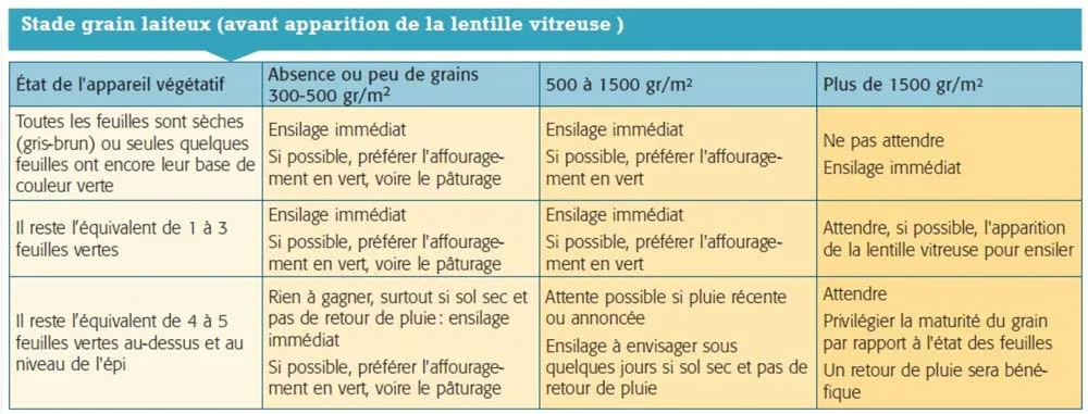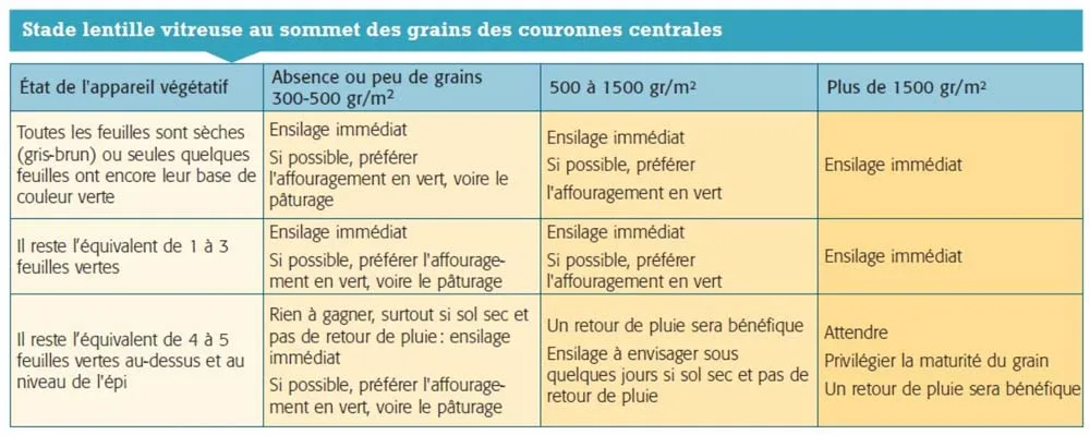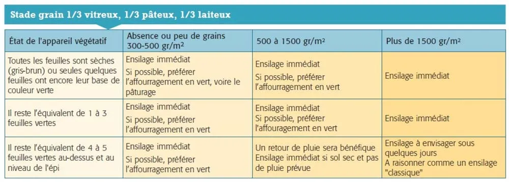 Dans tous les cas, la décision doit être prise en fonction du grain (nombre de grains par m² et stade de maturité) pondéré par l’état de l’appareil végétatif. Si la part des surfaces de maïs stressées est significative sur l’exploitation : plutôt que de trouver un mauvais compromis pour la date de récolte, il peut être judicieux d’envisager 2 chantiers d’ensilage. En récoltant d’abord les parcelles, ou les parties de parcelles, les plus avancées.