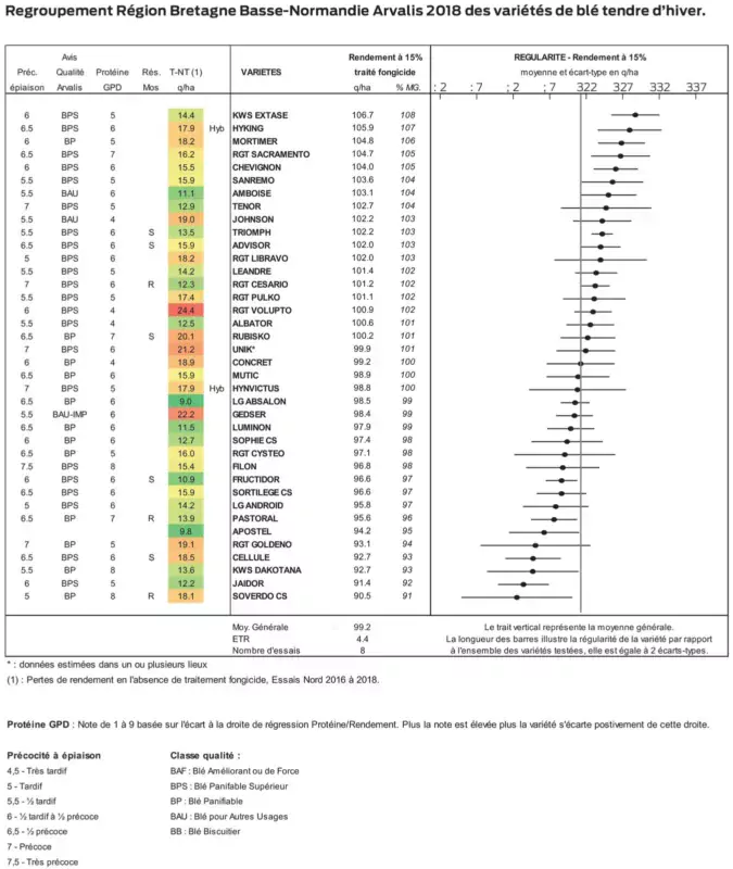Comme chaque année, de nouvelles inscriptions apportent du potentiel, mais aussi de la tolérance aux maladies. Cette année la nouveauté KWS Extase se classe en tête du regroupement 2018. « Nous remercions les partenaires bretons (coopératives Garun-Paysanne, Le Gouessant et Triskalia) qui se sont associés à Arvalis pour mettre en place et assurer le suivi des essais ».