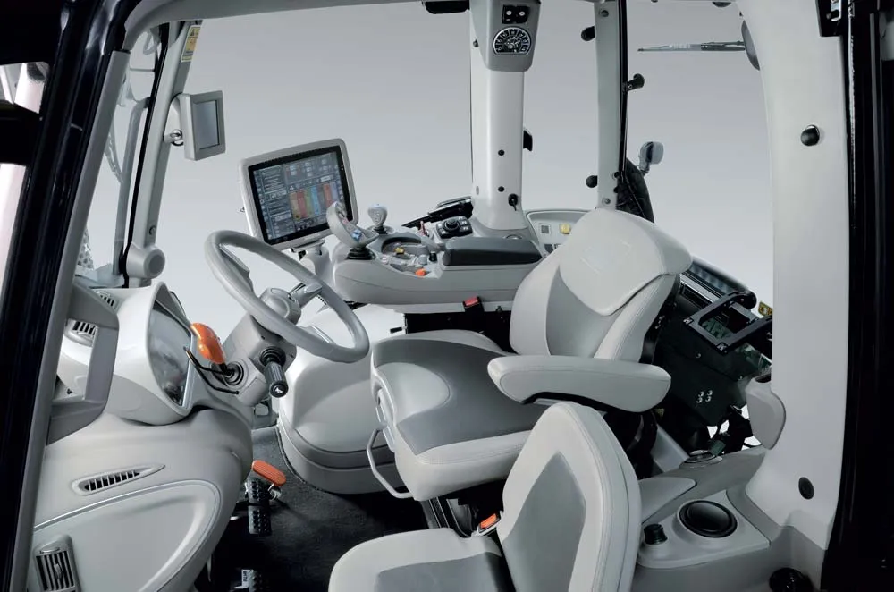 Dans la cabine, le tableau de bord (InfoCenterPro) inclut un écran couleur de 5 pouces et deux compte-tours de chaque côté de cet écran : un pour la vitesse et l’autre pour le régime moteur. « Un large accoudoir avec un joystick regroupe quasiment toutes les commandes, rangées par code couleur pour une prise en main simple : le vert pour le relevage, le bleu pour l’hydraulique, l’orange pour la transmission et le jaune pour la prise de force. » Dans son prolongement, se trouve l’iMonitor : un écran tactile de 12 pouces qui permet de gérer le moteur, l’hydraulique, le relevage, le GPS et l’Isobus.