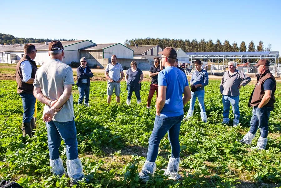 L’éleveur a implanté un mélange de couverts (radis, phacélie, vesce, moutarde) après moisson. Début octobre, le mélange a germé mais s’est peu développé. Deux bandes (essais) ont été fertilisées, l’une avec du lisier brut et l’autre avec du lisier ensemencé en micro-organismes pour les besoins de la journée technique. La première présente la biomasse la plus développée, les plantes sont sur le point de fleurir. Mickaël Travers, de la société Sobac, fournisseur du produit, donne une explication : « Dans la bande avec du lisier brut, qui est la plus belle à l’œil, le couvert a consommé beaucoup d’azote directement assimilable et s’est développé tout en gorgeant ses cellules en eau (pression osmotique). Celles-ci peuvent présenter des micro-fissures, susceptibles de laisser entrer des pathogènes, (d’où les besoins en protection fongique des cultures) ».