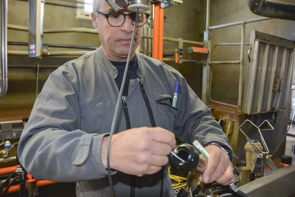 La température au sortir du chauffe-eau est mesurée par sonde. « La température doit être assez élevée au départ des canalisations pour rester au- dessus des 40 °C en sortie de lavage. Trop froide, l’eau favorise les dépôts ». Cette température est également importante pour le lavage, car une valeur supérieure à 75 °C fera évaporer la solution de lavage alcaline. « Il faudra alors utiliser un produit non chloré ». Dans la même idée, le prélavage ne doit pas se faire à l’eau froide, car elle fera baisser la température des canalisations, l’eau de lavage se refroidira alors beaucoup plus rapidement.