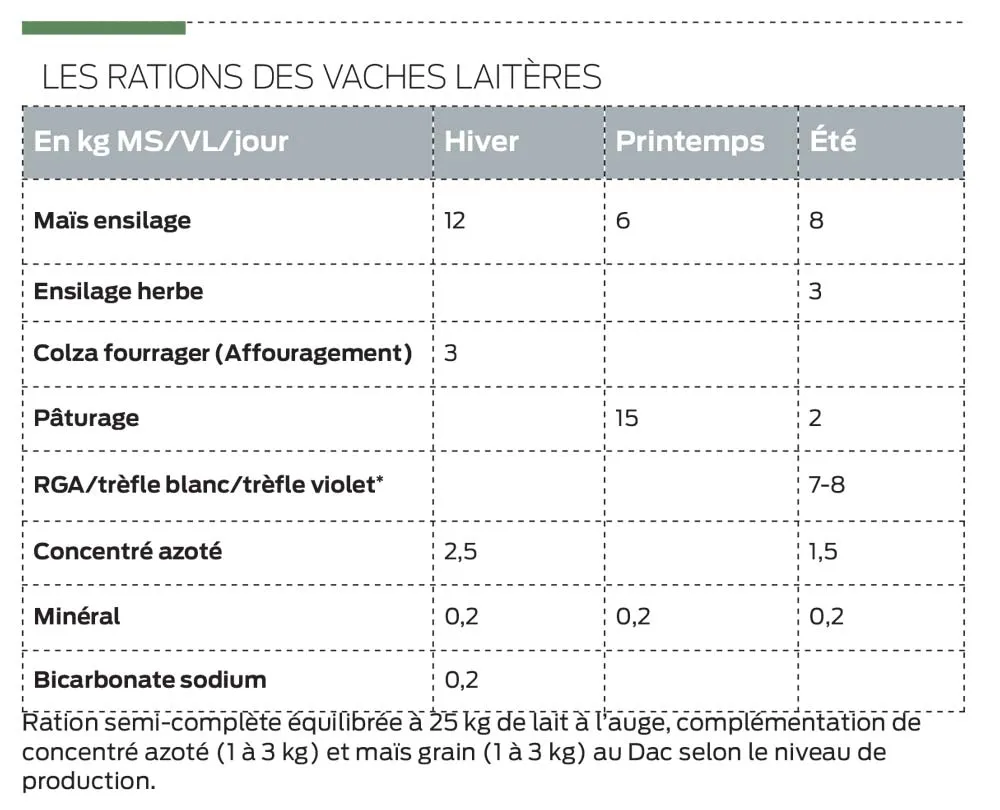 Pour passer de la ration à dominance maïs d’avant 2012 (18 kg MS maïs ensilage / animal / jour) à la ration actuelle (en moyenne 10 kg), les éleveurs ont débuté par un affouragement avec du colza fourrager en période hivernale. Depuis l’investissement dans une remorque distributrice en 2015, l’affouragement est réalisé 9 mois de l’année : colza fourrager en hiver, mélange de RGA, trèfle blanc et trèfle violet en été. La part de maïs ensilage est réduite à 11 kg en hiver et 8 en été. Au printemps, la ration est uniquement composée d’herbe pâturée.
