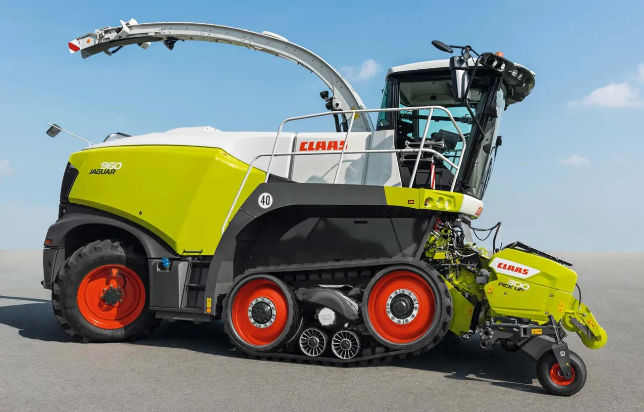 Cette rupture technologique en matière de véhicules chenillés a été obtenue simplement en pilotant les systèmes hydrauliques existants sur le train de chenilles suspendues. En fonction de l’angle de braquage, la pression hydraulique sur les rouleaux de maintien des chenilles augmente automatiquement. Seuls les rouleaux de maintien et les galets arrière moteurs touchent encore le sol, ce qui réduit d’environ un tiers la surface de contact au sol. La JAGUAR 960 TT se voit rallongée de plus d’un mètre par son équipement chenillé, ce gabarit plus conséquent procure un vrai avantage en termes d’entretien, notamment pour ce qui est de l’accès à l’éclateur et à l’accélérateur. Le frein à l’équipement des ensileuses en trains chenillés étant de ce fait levé, la solution apporte de plus une réponse satisfaisante au problème réglementaire des charges maximum par essieu. La limite des 13 tonnes sur route, récemment portée à 14 tonnes sous la pression des constructeurs, est allègrement franchie par les matériels de récolte, dès l’instant qu’ils portent leurs équipements frontaux repliables. La circulation sur route bénéficie de la vitesse de 40 km/h (lorsque la législation le permet) et d’un gabarit hors tout de 3 m.