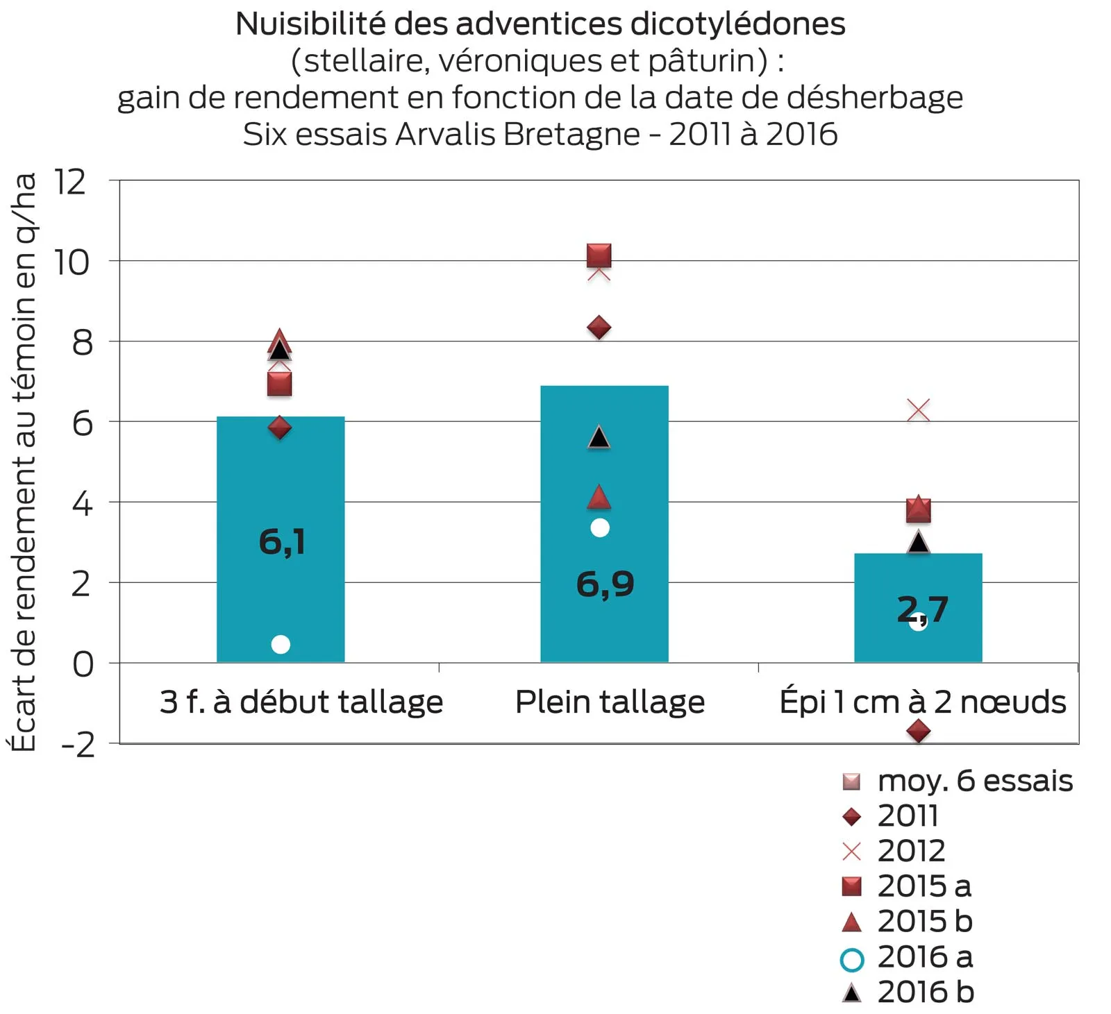 Pour les semis plus tardifs (mi à fin novembre), la levée des adventices est retardée et l’intervention peut être décalée sur janvier ou février en fonction de l’observation des adventices. Six essais ont été conduits par Arvalis en Bretagne de 2011 à 2016 pour mesurer la date optimale de désherbage dans un contexte de flore évolutive à base de stellaires, véroniques et pâturins. La réponse obtenue est la même quels que soient le contexte et le potentiel de la parcelle.