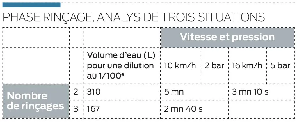 Cette étape ne dure que 5 minutes, c’est la fin du chantier, on ne s’en souvient plus… « Or, le phénomène de dérive est souvent présent lors de cette étape de rinçage », alerte Philippe Garde, ingénieur agriculture durable chez Syngenta. Pour arriver à un fond de cuve dilué à 1/100e, imposé par la réglementation avant de pouvoir vidanger le volume de fond de cuve au champ, il est souvent pratiqué deux rinçages. « Car trois rinçages sont souvent assimilés à plus de consommation d’eau, plus de travail… C’est une idée reçue », déplore-t-il. Du fait des dilutions, trois rinçages utilisent 2 fois moins d’eau et 2 fois moins de temps. À vos calculs…