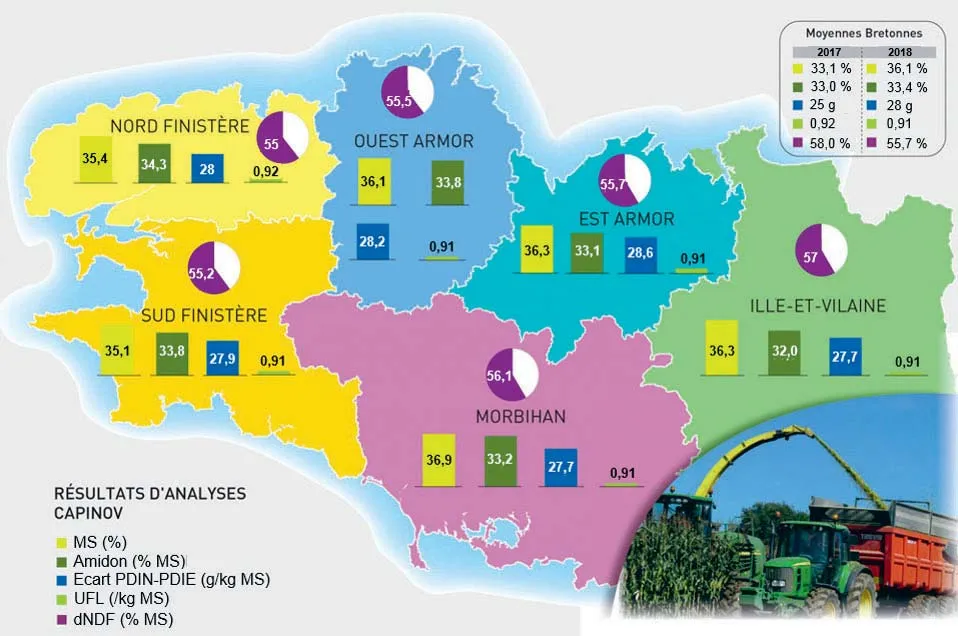 Cette remarque ressort régulièrement cette année. Au niveau des résultats d’analyses de lait dans les élevages Triskalia, le TB est supérieur de 1,3 point en moyenne depuis mi-octobre par rapport à la même période l’an passé : 43,8 g/L (contre 42,5 en 2017). En ce qui concerne le TP, il est supérieur de 0,6 point en moyenne : 34 g/L (contre 33,4 l’an passé). Cela permet aux éleveurs de bénéficier d’une meilleure plus-value. En revanche, les premiers retours sont très hétérogènes en ce qui concerne le potentiel laitier des ensilages. Plusieurs secteurs subissent une baisse de production de 2 à 3 kg de lait. Dans d’autres endroits, elle reste stable. Il convient alors d’étudier la qualité de cette nouvelle récolte, pour s’y adapter le mieux possible et optimiser la production des vaches laitières. Les données moyennes qui suivent proviennent des 961 analyses d’ensilage de maïs fermenté de la récolte 2018, réalisées par le laboratoire Capinov.