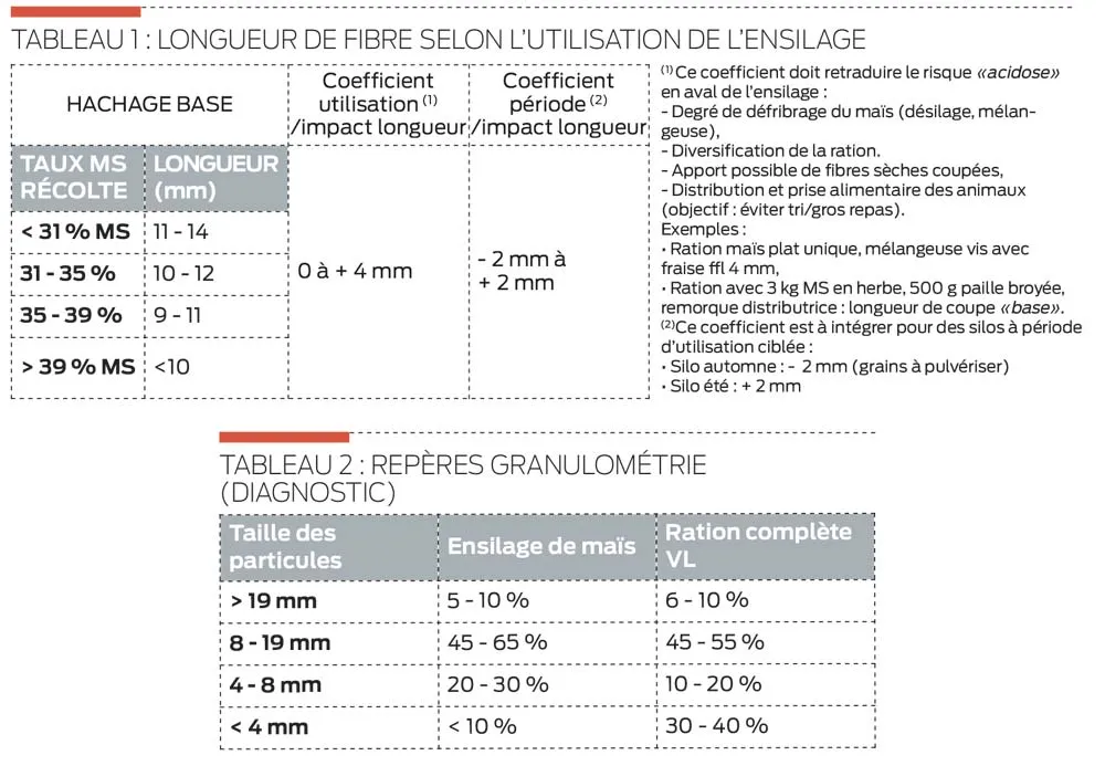 Côté nutrition, si la clé d’entrée est le taux de matière sèche – avec un objectif à 31 – 35 % MS pour un ensilage de qualité –, il est recommandé de partir d’une longueur repère (hachage base) à laquelle on affecte deux coefficients (Cf. tableau 1). Le premier correctif retraduit en quelque sorte le risque « acidose » en aval de l’ensilage. De 0 à + 4 mm, les facteurs à prendre en compte concernent le dessilage, le mode de distribution et le rationnement…
