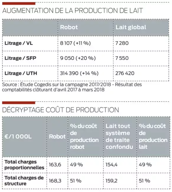 Dans les premiers mois qui suivent son installation, le robot de traite entraîne une augmentation du coût de production. La traite robotisée va notamment peser sur les charges proportionnelles, surtout en raison de la hausse du coût de l’alimentation. À titre d’exemple, lorsque l’on compare un échantillon d’éleveurs équipés en traite robotisée avec un échantillon d’éleveurs tous modes de traite confondus, on observe que seule la hausse du poste alimentation n’est pas compensée par l’augmentation de litrage. En traite robotisée, ce poste représente 22 % du coût de production contre 18 % pour l’échantillon d’éleveurs, tous modes de traite confondus.