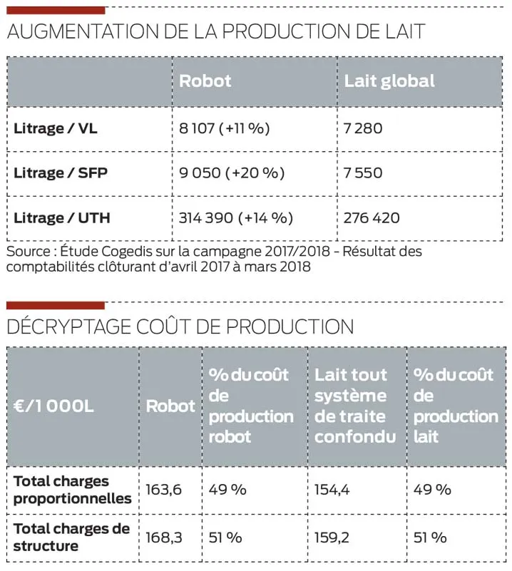 Dans les premiers mois qui suivent son installation, le robot de traite entraîne une augmentation du coût de production. La traite robotisée va notamment peser sur les charges proportionnelles, surtout en raison de la hausse du coût de l’alimentation. À titre d’exemple, lorsque l’on compare un échantillon d’éleveurs équipés en traite robotisée avec un échantillon d’éleveurs tous modes de traite confondus, on observe que seule la hausse du poste alimentation n’est pas compensée par l’augmentation de litrage. En traite robotisée, ce poste représente 22 % du coût de production contre 18 % pour l’échantillon d’éleveurs, tous modes de traite confondus.