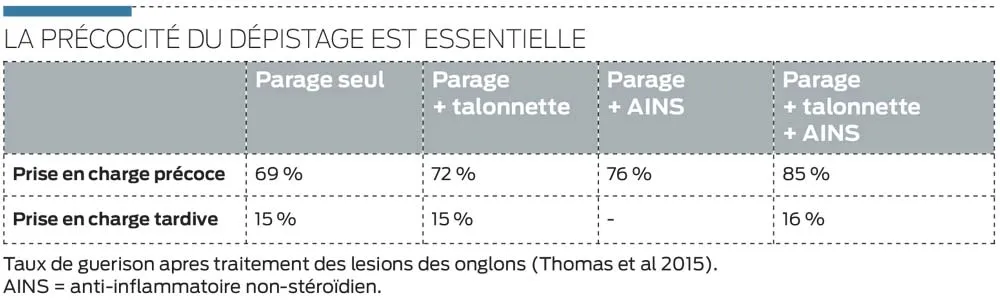« Le rôle de l’éleveur est fondamental dans la maîtrise des boiteries car c’est avant tout sur lui que repose l’observation des animaux », démarre Marc Delacroix, lors d’une journée technique de la société Zinpro. Or d’une indispensable détection précoce dépend une bonne partie de l’efficacité de la prise en charge. La preuve par les chiffres (voir tableau) : « Lors d’une prise en charge précoce avec parage, pose de talonnette et administration d’anti-inflammatoire, le taux de guérison d’une lésion de l’onglon est de 85 %. Ce résultat tombe à 16 % pour les mêmes soins lors d’une prise en charge tardive… », rapporte le spécialiste.