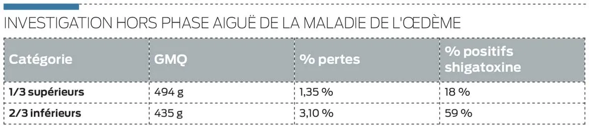 Une nouvelle étude a été réalisée en 2018, avec le concours du groupement Triskalia pour répondre à ces questions. 33 élevages ont été sélectionnés, qui ne présentaient pas de signes cliniques de la maladie et qui n’étaient pas vaccinés. Des prélèvements (pédi chiffonnettes) y ont été réalisés pour analyse. Ces élevages ont été classés en deux groupes : le tiers des plus performants en GTE et les deux tiers les moins performants. Les résultats (voir tableau) montrent que les élevages du premier groupe, avec des performances zootechniques supérieures et un taux de perte moindre, ont trois fois moins de prélèvements positifs à la shigatoxine. Ce constat alimente l’hypothèse de l’action de la toxine hors phase aiguë (sans cas clinique) d’où l’importance de connaître le statut de son élevage.