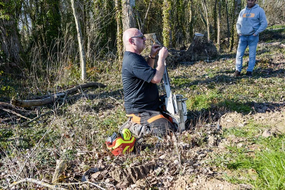 « Une chaîne se tend, elle ne se détend pas », prévient le formateur. Le guide est légèrement orienté vers le haut lors de la tension. Si le guide est mal positionné, « la chaîne va se détendre quand on appuiera sur l’arbre. La chaîne est tendue quand les maillons d’assemblage touchent le guide. La chaîne ne ballotte pas, mais conserve une petite souplesse ». Le guide est à retourner toutes les semaines, pour garder une usure uniforme.