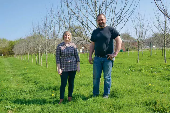Céline a repris l’activité de cidrerie sur Vieux-Viel en 2012, l’adossant à l’exploitation de son mari, lui-même installé en 2005 en productions de lapins et cultures de vente. « Nous avons construit un nouveau bâtiment en 2015 et replanté des pommiers à côté. Nous avons aussi planté des sureaux. » Au total, l’exploitation compte 9,5 ha de vergers avec 27 variétés de pommes à cidre et à jus, et quelques variétés de pommes à couteau. « Nous avons aussi réintroduit des variétés anciennes comme la Reinette du marais ou la Gros Jamy. » Pour assurer la pollinisation, des ruches ont été installées il y a 4 ans.