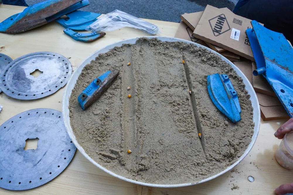 Même à une bonne vitesse d’avancement (5 km/h pour un semoir à socs, 6,5 à 7 km/h pour un semoir à disques) et la bonne densité réglée, un soc usé va entraîner des irrégularités d’implantation de la graine dans le sillon : cette dernière va rouler dans la gouttière formée, plus évasée. Un soc en bon état forme, quant à lui, un sillon en forme de V précis où la graine reste coincée. C’est vrai également pour les semoirs à disques possédant une « pointe soc » entre les deux disques de l’élément semeur. « Ce sont des pièces principales à regarder tous les ans et au cours de la saison pour les semoirs fortement sollicités ».