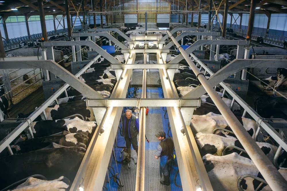 La vision des trayeurs est parfaite dans la fosse, les griffes descendant jusqu’au sol avant le branchement. Une fois un faisceau posé, le poste situé à côté remonte automatiquement, afin d’éviter aux éleveurs de se baisser.