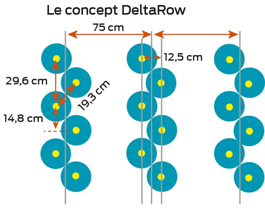 La société Lemken a travaillé pour mettre au point un semoir à maïs spécifique pour le semis en quinconce. Une démonstration du semoir monograine Azurit 9 de 8 rangs s’est déroulée jeudi 2 mai chez un client d’Alexandre Henry, entrepreneur de travaux agricoles à Lanfains (22). Sur chaque élément semeur, un moteur électrique entraîne un tambour de distribution avec des trous décalés permettant de semer la graine en quinconce avec un espacement de 12,5 cm (voir schéma ci-dessous). Grâce à la synchronisation des rangs, il est possible de déposer très précisément les semences en formant un triangle. L’espacement intérieur entre 2 rangs de 62,5 cm offre la possibilité de désherber mécaniquement.
