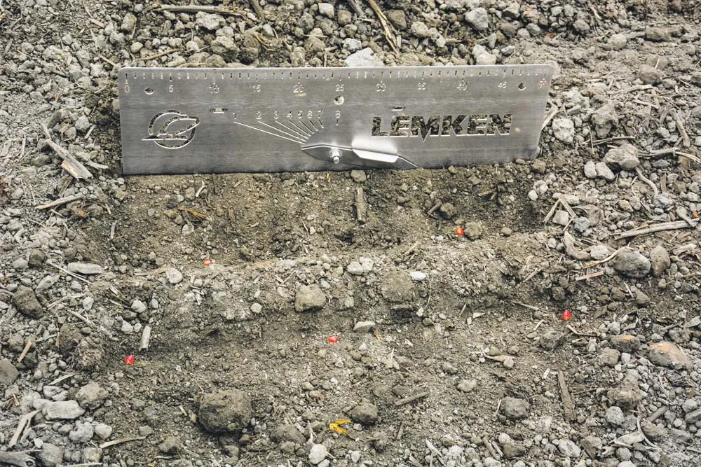 « En comparaison des semis à un seul rang, cette technique procure 70 % d’espace supplémentaire ce qui signifie davantage d’eau, de nutriments et de lumière pour chaque plant. Une seule ligne d’engrais starter est déposée en localisé à 7 cm de profondeur entre les 2 rangs semés en quinconce ce qui permet l’implantation symétrique des unités de semis », explique Frédéric Phelippeau, inspecteur commercial Lemken. Avec cette méthode de semis, il est préconisé de semer 8 à 10 % de graines en plus. « Avec cette façon de semer le maïs, nous optimisons la répartition des plants sur la parcelle. Par conséquent, le sol sera couvert plus rapidement au début de la période de développement. Cette meilleure répartition participe à la lutte contre l’érosion et limite le développement des adventices. On constate une augmentation de la biomasse et un meilleur enracinement avec des pieds plus gros et donc une culture moins sensible à la verse », décrit Frédéric Phelippeau.