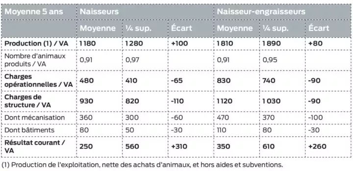 Le quart des élevages les plus performants* dégage deux fois plus de revenu par exploitant que la moyenne. Ramené par vache allaitante, l’écart de revenu entre la moyenne et le quart supérieur approche 310 € par vache chez les naisseurs et 260 € par vache chez les naisseur-engraisseurs, en moyenne sur 5 ans. L’analyse des résultats de ces exploitations rentables économiquement fournit des pistes de réflexion.