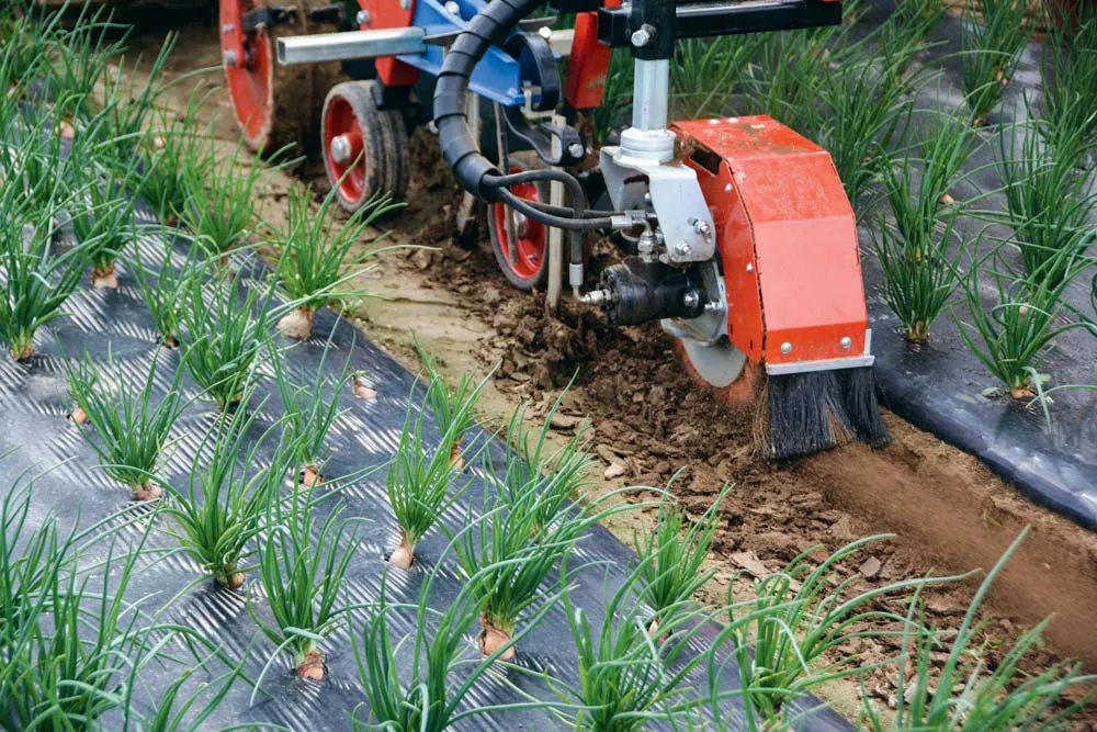 Les brosses hydrauliques développées par la société TerraTeck éliminent les adventices au plus près du paillage, sans risques de dégrader celui-ci.