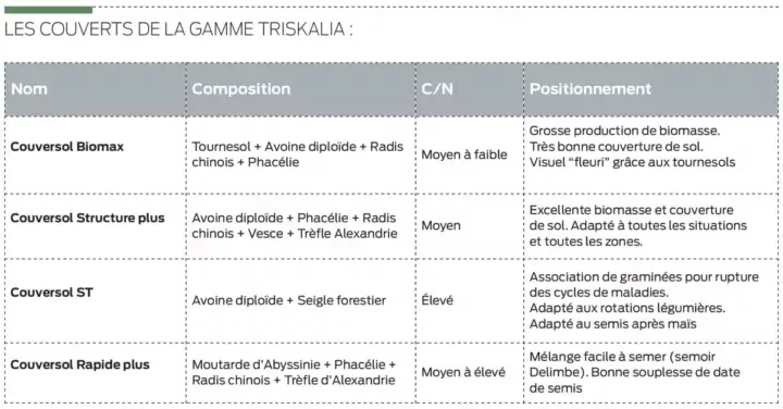 Il faut bien choisir ses espèces selon le niveau de matière organique des sols. Dans les sols avec des niveaux hauts, rapport C/N (carbone/azote) élevé, mieux vaut s’orienter vers des couverts avec des C/N faibles à moyens. Ces derniers fourniront un humus labile, plus facilement utilisable pour la culture suivante. À l’inverse, dans les sols à C/N faible, l’objectif sera de les enrichir en matière organique avec des couverts ayant des C/N élevés (plus riches en fibres). Leur restitution directe sera donc plus lente.