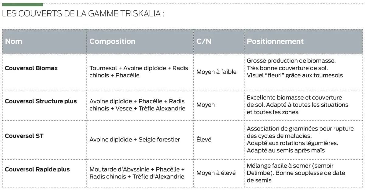 Pour renforcer la fertilité des sols en agriculture biologique, le mélange Chlorofiltre Mix + est particulièrement adapté. L’association de l’avoine, de la phacélie, du radis, de la vesce et du trèfle d’Alexandrie combine des espèces à biomasse et systèmes racinaires variés pour une bonne couverture et structure du sol. La présence de 20 % de légumineuses permet de restituer de l’azote au sol. Bien développé, le couvert est sensible au gel. Selon le positionnement et le système, d’autres compositions peuvent être adaptées, comme le Chlorofiltre DF New. Vendus en 2018, ces couverts ont largement satisfait leurs utilisateurs. Pour Frédéric Gazan, technicien en agriculture biologique, « avec un automne et hiver particulièrement doux en 2018, le couvert Mix + a montré tous ses effets positifs de couverture de sol.». Pierre Cougard / Triskalia