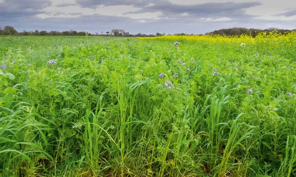 Les associations d’espèces ont aussi prouvé leur intérêt. Pour ce qui est de la partie visible, nous chercherons des espèces produisant beaucoup de biomasse avec des ports érigés, mais aussi des plantes plus prostrées afin d’assurer la couverture du sol. Au niveau souterrain, l’objectif est de travailler les différents horizons. Seuls les mélanges y arriveront, avec le recours à différents systèmes racinaires (pivotant et fasciculé). Les légumineuses, autorisées à hauteur de 20 % du mélange en Bretagne, ont également un bon effet symbiotique dans les associations d’espèces et permettent de bonnes restitutions aux cultures suivantes.