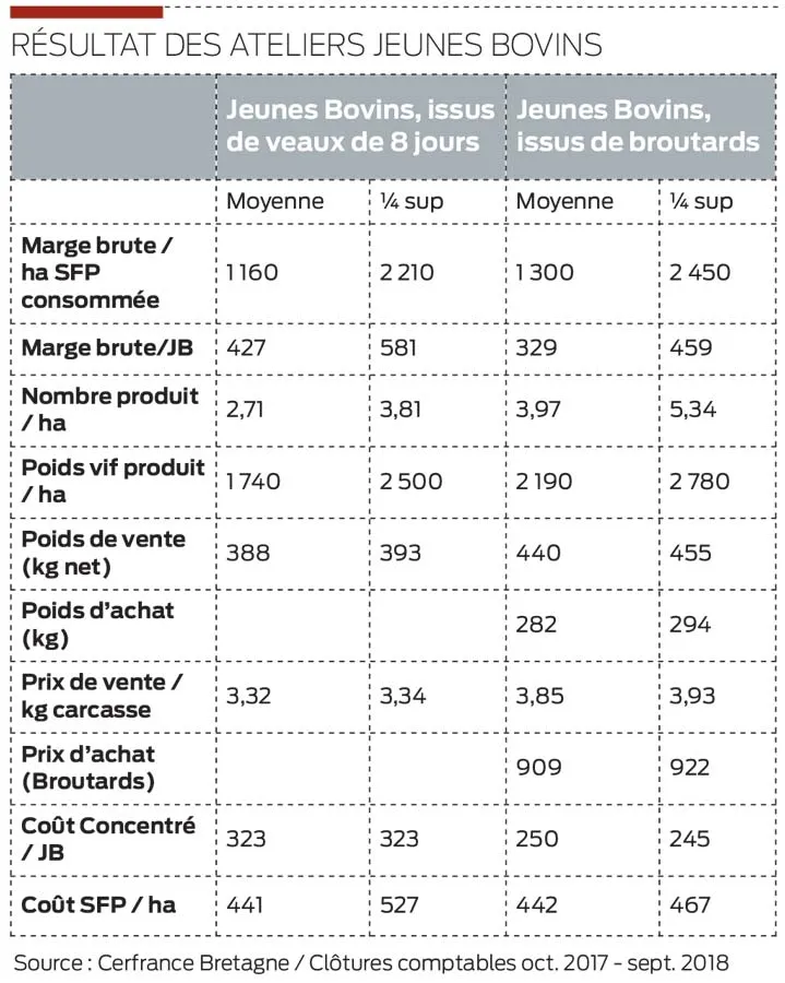 • Le poids de viande produit par ha. Les meilleurs éleveurs en JB à partir de veaux sortent 760 kg / ha de plus et près de 600 kg / ha en JB issus de broutards, grâce à un nombre de jeunes bovins produits par hectare supérieur, tout en conservant un coût de concentré par JB équivalent.